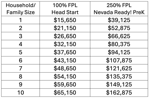 The Nevada Legislature expanded eligibility requirements for the Nevada Ready! PreK program in the 2025 Legislative session, which took effect on July 1, 2025. Children are now eligible for Nevada Ready PreK if: